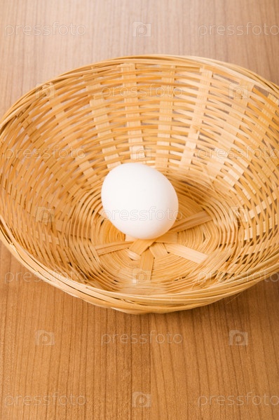 Куриное яйцо в корзинке на деревянном столе
