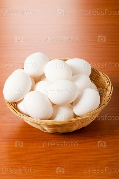 Куриные яйца в корзинке на деревянном столе