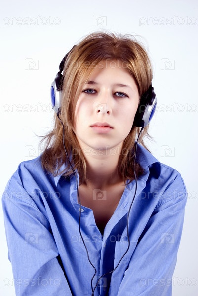 Портрет молодой девушки в наушниках на белом фоне