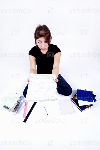 Портрет симпатичной молодой студентки с кучей тетрадей на белом фоне
