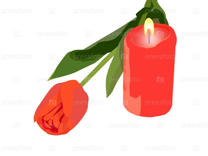 Картина тюльпан и горящая свеча в изолированном белом цвете