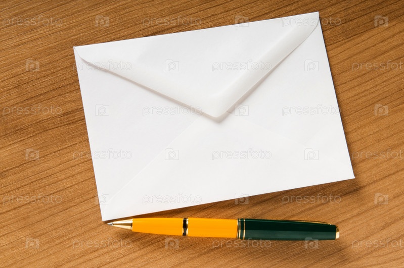 Пустой конверт и ручка, лежащие на столе