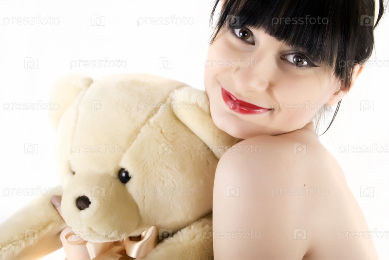 Портрет симпатичной молодой брюнетки с плюшевым мишкой на белом фоне