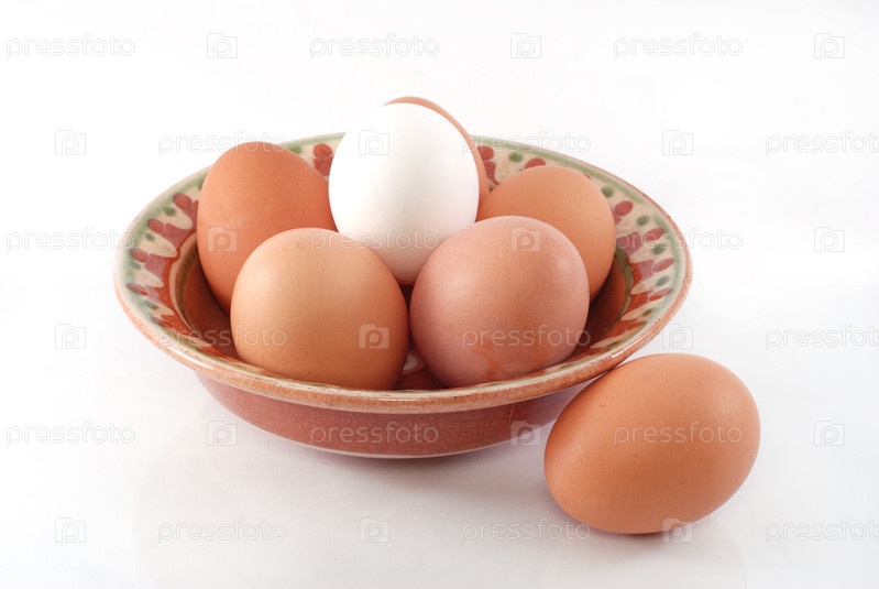 Куриные яйца в глиняной тарелке