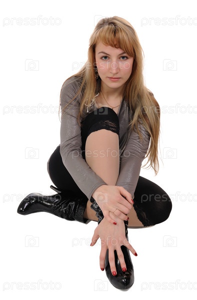 Сидящая серьезная блондинка в сапогах над белым
