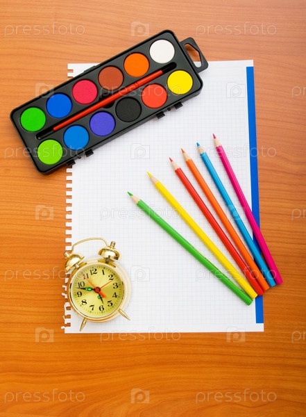 Цветные карандаши, акварельные краски, лист бумаги и будильник