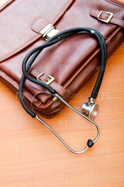 Портфель врача и стетоскоп на деревянном фоне