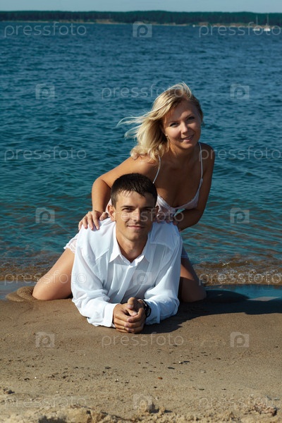 Блондинка в пеньюаре и мужчина в белой рубашке лежат на пляже