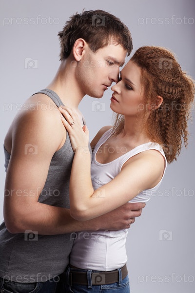 Портрет молодой пары на сером фоне