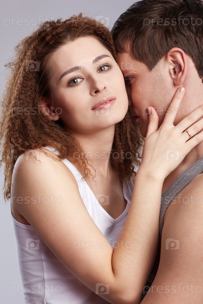 Портрет молодой пары на сером фоне