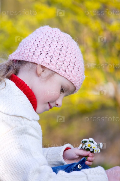 Маленькая девочка собирает маргаритки на поляне