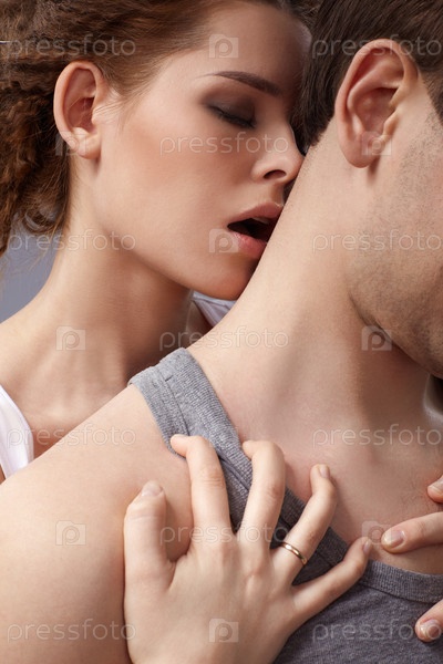 Портрет молодой влюбленной пары на сером фоне