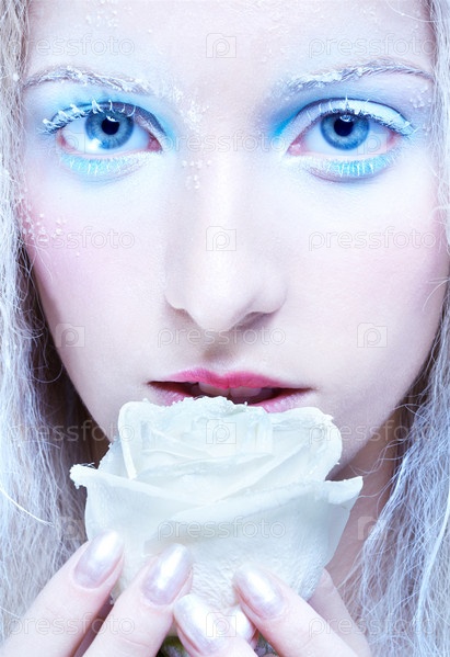 Девушка с макияжем, имитирующим снег, держит белую розу