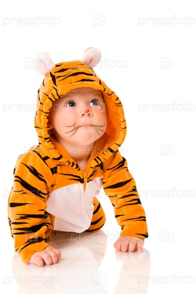 Шестимесячный ребенок в костюме тигра на белом фоне