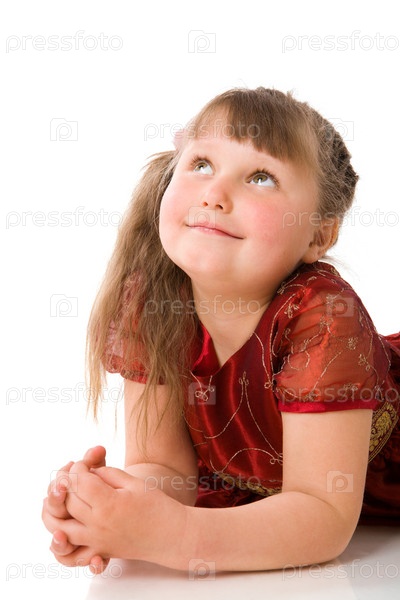 Счастливая нарядная девочка на белом фоне
