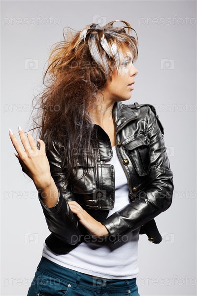Девушка в кожаной куртке, у которой волосы и лицо в белой краске