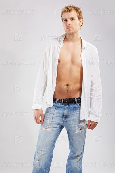 Привлекательный блондин в белой рубашке и джинсах