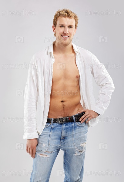 Привлекательный блондин в белой рубашке и джинсах