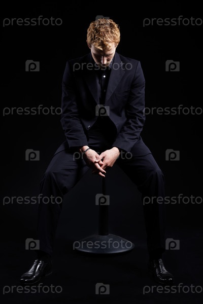 Молодой человек со светлыми волосами в костюме на черном фоне