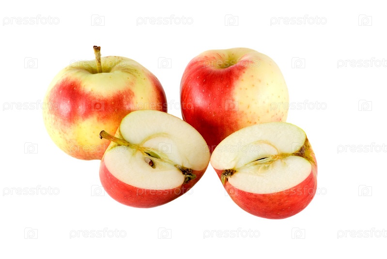 Два целых яблока и две половинки яблока на белом фоне