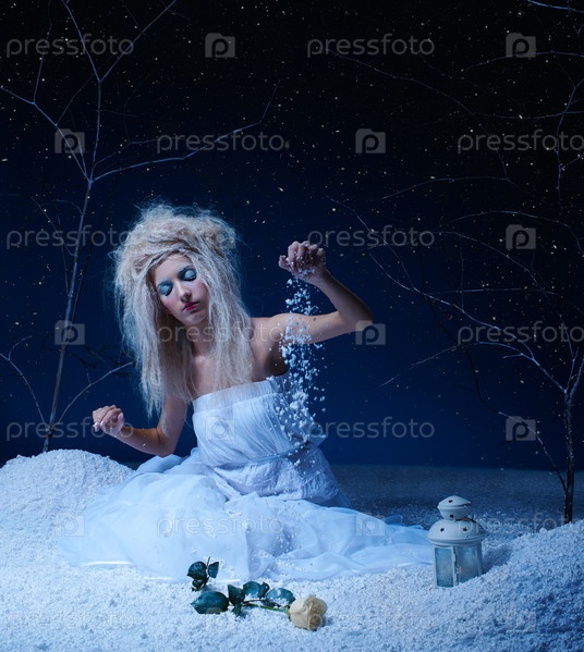 Сказочная фея сидит на снегу с розой