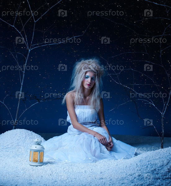 Сказочная фея сидит на снегу с лампой