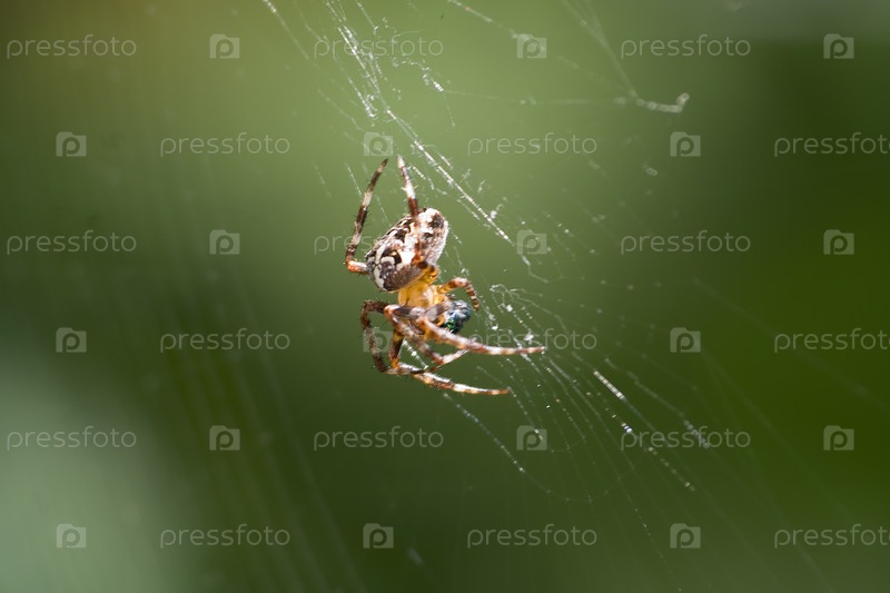 Паук сидит на паутине на зеленом фоне