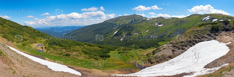 Летний пейзаж: Черногорский хребет, местами покрытый снегом, и руины обсерватории