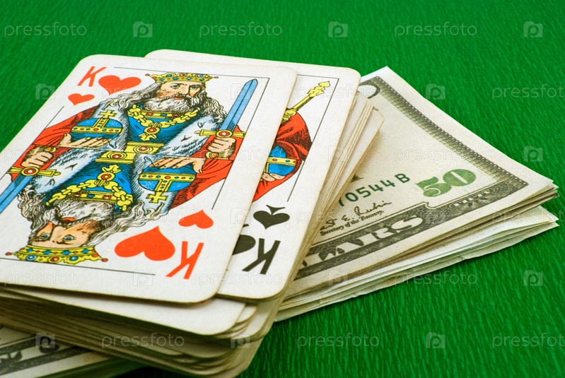 Колода карт на пачке долларов на зеленом фоне