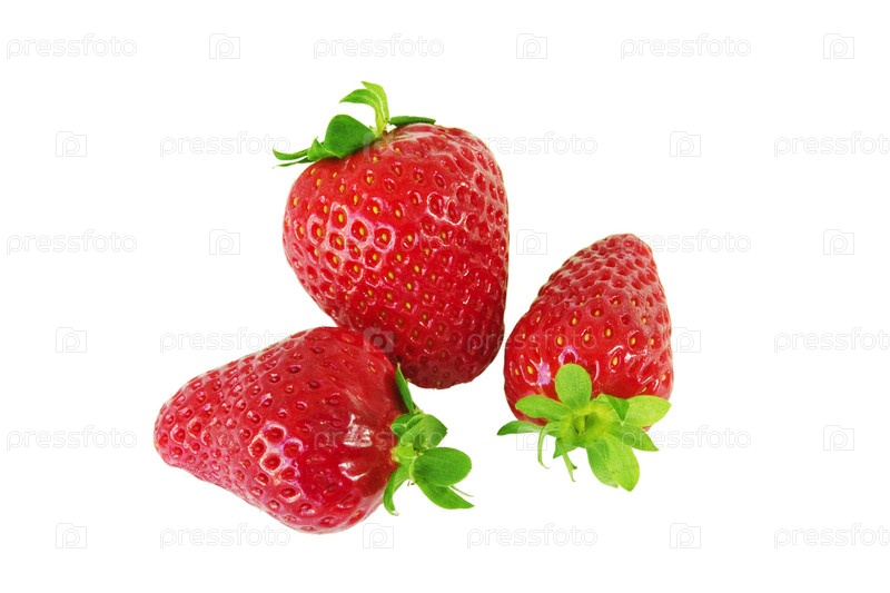 Три красных клубники с зелеными листьями, изолированные на белом фоне