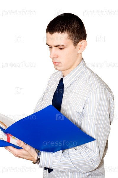 Молодой человек в светлой рубашке с синим галстуком читает документы в синей папке, на белом фоне