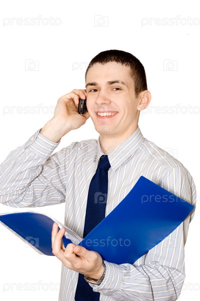 Молодой человек в светлой рубашке с синим галстуком держит синюю папку с документами, говорит по мобильному телефону и улыбается на белом фоне