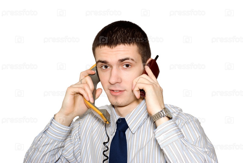 Молодой человек в светлой рубашке с синим галстуком говорит одновременно по двум телефонам на белом фоне