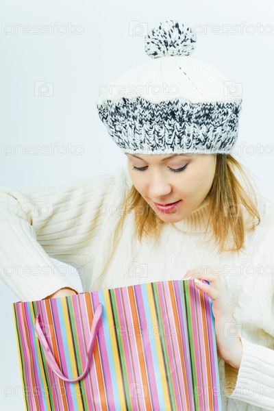 Девушка в зимней шапке с покупкой