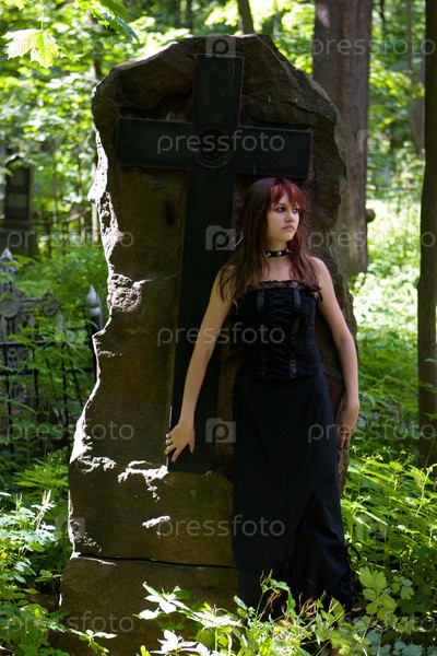 Молодая девушка в черном платье, гуляющая по кладбищу