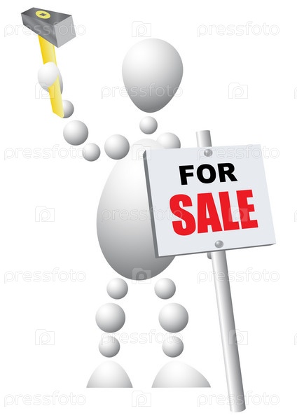 Человечек вбивает в землю табличку "На продажу"