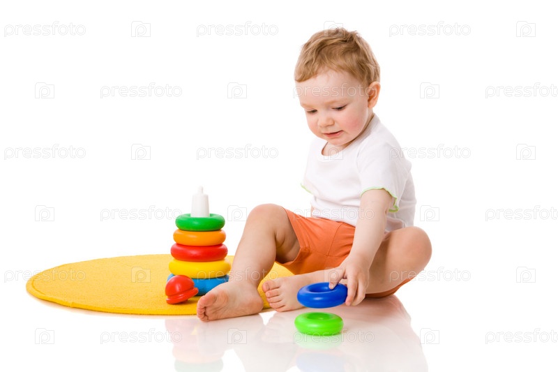 Маленький симпатичный мальчик с игрушками на белом фоне