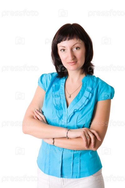 Красивая молодая женщина в голубой блузе на белом фоне