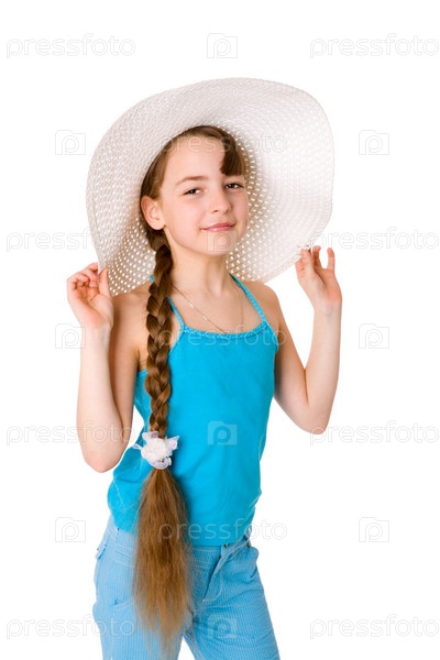 Портрет длинноволосой девочки в шляпке на белом фоне