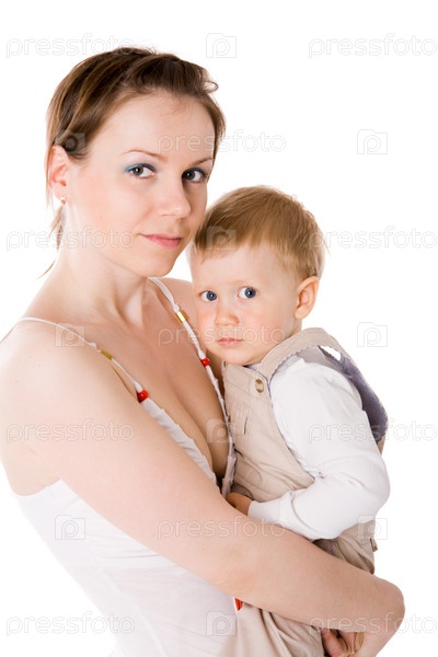 Портрет матери, держащей на руках сына на белом фоне