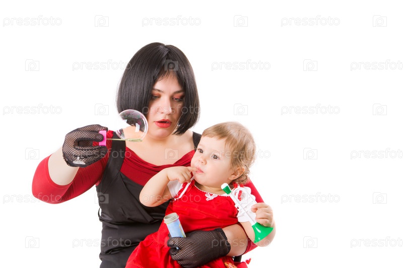 Мать играет с дочкой мыльными пузырями на белом фоне