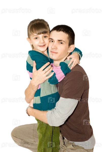 Молодой человек в коричневой футболке и девочка в цветном свитере обнимаются на белом фоне