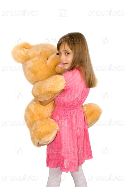 Девочка в розовом платье с плюшевым мишкой на белом фоне