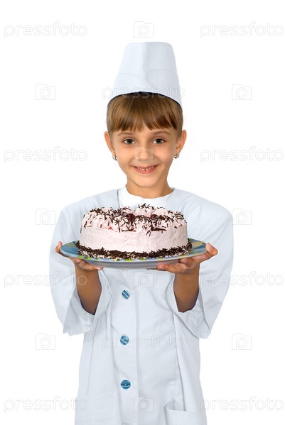 Девочка в белом халате и колпаке с тортом на белом фоне