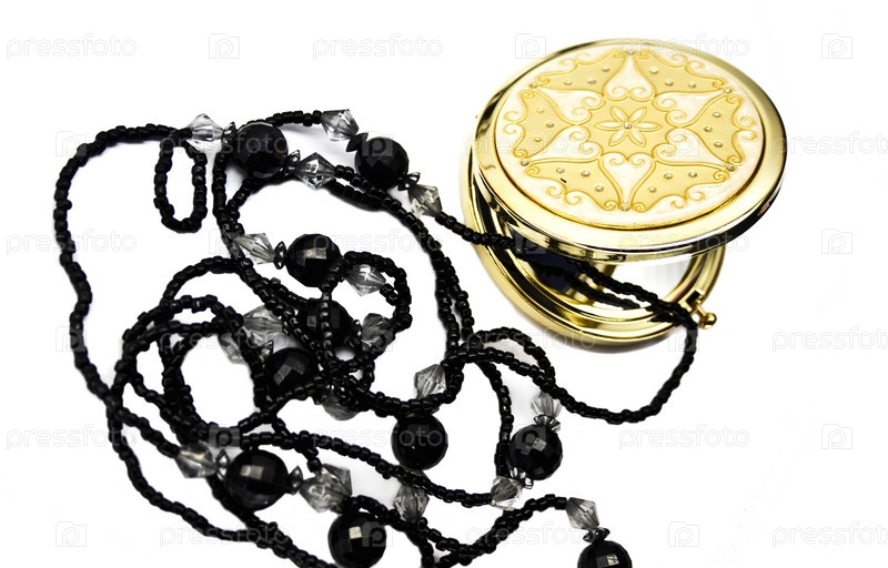 Карманное зеркало и бусы на белом фоне
