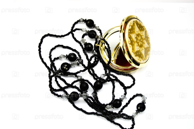 Карманное зеркало и бусы на белом фоне