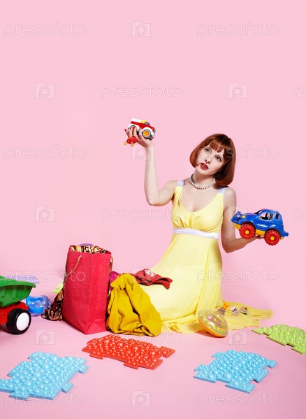 Девушка сидит на полу с детскими игрушками