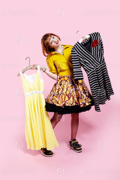 Девушка выбирает из двух платьев