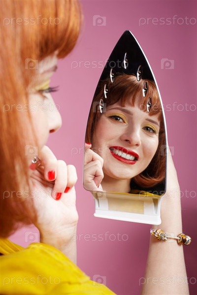 Девушка смотрит на свое отражение в утюге