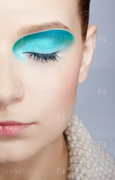 Половина лица девушки с закрытым глазом с макияжем в голубых тонах